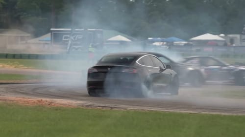 The Wisefab-kitted Tesla build got its first real track time. Backies went down and the tires took a beating... All in near-silence.