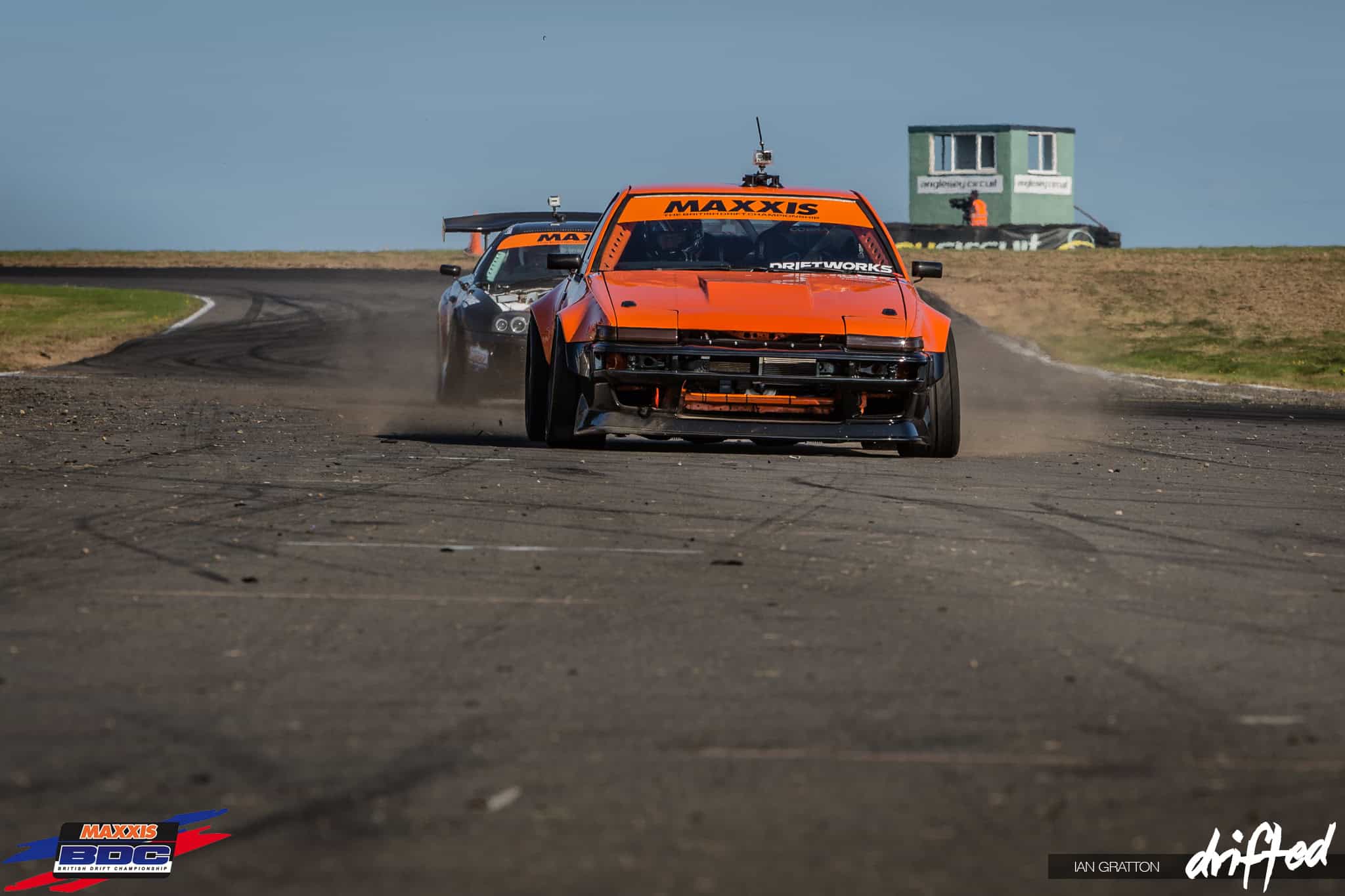 With O’Sullivan leading the first battle Richard Grindrod’s LS-powered M3 stays glued to the side of the Japspeed S15 through the first turn. Shane massively aware of this takes a shallower line on the rear clip along the pit wall sacrificing some angle and smoke for traction in an attempt to shake the orange BMW. By the end of the run this hasn’t happened and Mr Grindrod is still right by his side.