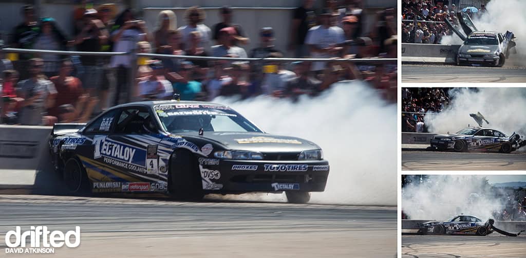 Bruce Tannock had an unfortunate incident with the wall in his battle with Hugo Maclean, damaging both the Rocket Bunny kit and Work Meisters. Sadly this wasn’t the last accident we would see today.