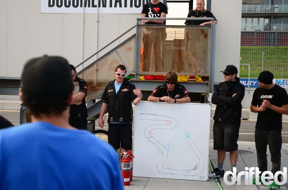 The morning started in very similar fashion to the previous. Here is head judge and ex-D1NZ driver Nick Teeboon explaining the judged section and clipping points. D1NZ has a lot of people that help behind the scenes, so I’d quickly like to point out who some of them are. To the left of Nick is his brother Dan, who takes care of scrutineering/marshals/pits and any off track adventures. And on the right we have the two other judges, Kyle Jackways and Sam Groombridge, followed by D1 commentator and former D1NZ Drift King Jairus Wharerau. Oh and I almost forgot, standing above them all is Theresa Knight who makes sure all the drivers get out into the grid on time!