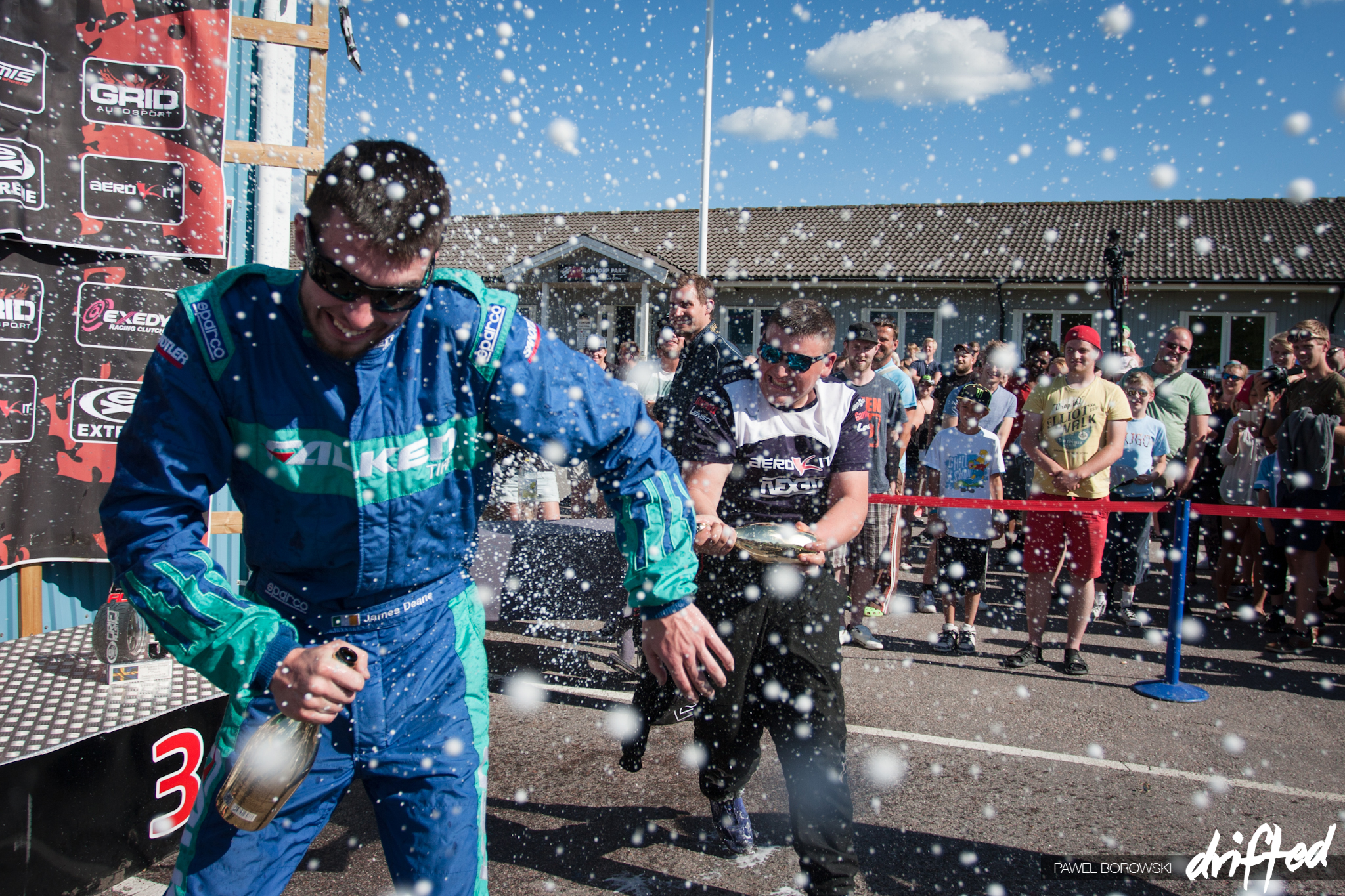 Champagne all round! Jack Shanahan (still under age) is happy to spray some bubbly on his very first Drift Allstars Europe podium. No better person to spray champagne on but his coach as of the last two years, James Deane.