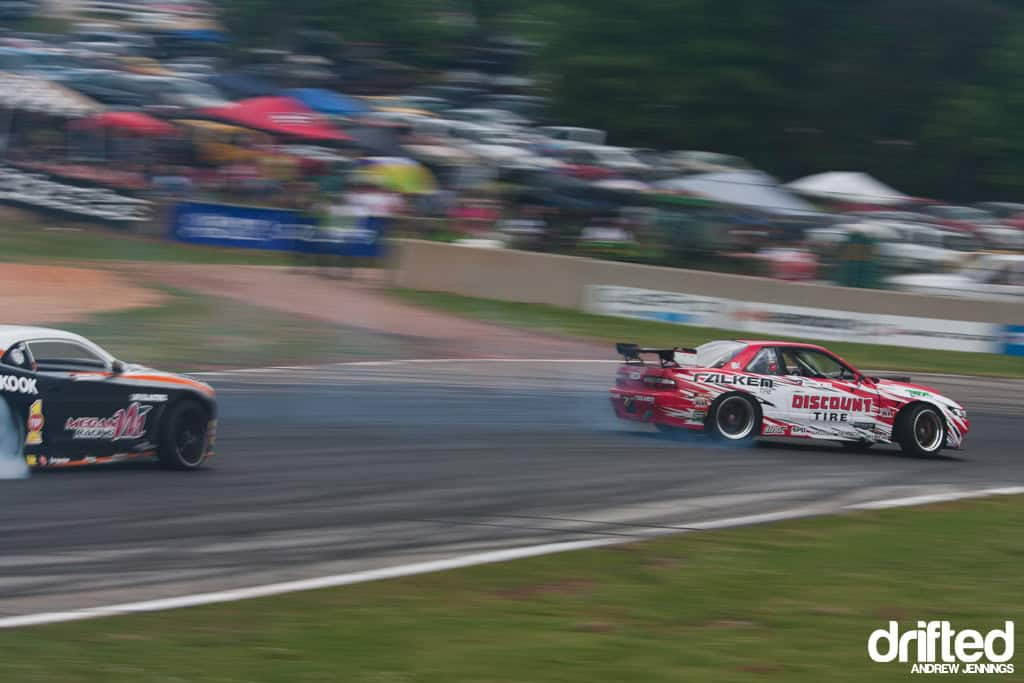 Last up for the Top 32 that is worth a look was the battle between Conrad Grunewald and Daijiro Yoshihara. Yoshihara was leading the overall championship points coming into Road Atlanta after a close win in Long Beach. Grunewald is always a tricky battle since he rarely has much to lose, lacking the pressure that comes from being at the top of the standings. It’s unclear if Yoshihara was having some mechanical issues, or if it was just an off day, but in the first lead run he couldn’t seem to initiate drift very well after the first corner. I chose the photo above to illustrate how little smoke his Falken Tire Nissan S13 was putting out as they went through the final corner, compared to Grunewald who was still hot in the rear during the transition. The judges could see Yoshihara grabbing the e-brake more than once at each of the clipping points, struggling to keep the back sideways. The second run was much the same way, as Grunewald put on a clinic in his Megan Racing Hankook Chevrolet Camaro SS, hitting every part of the track perfectly. Yoshihara tried to keep good proximity, but he did this at the expense of angle, fighting the car and wiggling multiple times without getting much smoke down. All of this was enough to make the decision clear for the judges, and Grunewald knocked Yoshihara out of the Top 32, a huge blow for the overall championship.