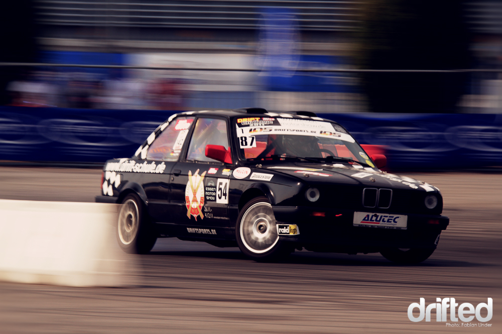 First training, first shock. Markus “Drifthunter” Müller crashed his E46. After the accerelation line he tried to initiate with a manji, hit the surrounding and spun into the poles and fences. He wasn´t harmed, but his BMW was dented on all sides.