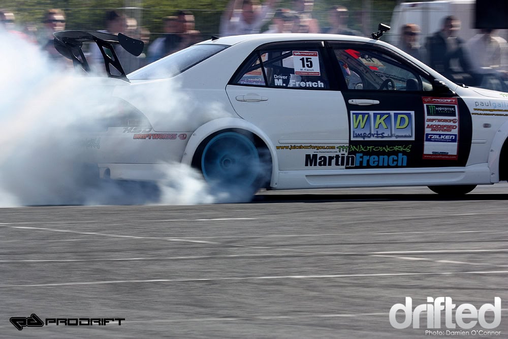 It’s fair to say I’m still pretty shattered from what really was a spectacular weekend’s drifting in the opening round of Prodrift’s 2011 season. As I descended on my two hour trip early Saturday morning to the Co.Clare venue dark clouds hung overhead, I was getting flashbacks of the washout at this venue two years ago and really was not looking forward to a return of the same, but almost as if the Drift Gods were looking down on us from above, sun broke though in Ennis, Co.Clare and blistered over a packed crowd for the entire weekend.